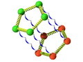 The following is a schematic for the interaction between atom i (green) and atom j (orange). Here we show the atoms having five Trotter slices, forming what can be thought of as a "ring polymer molecule". The harmonic springs between Trotter slices are in yellow, and white/blue bonds represent the intermolecular pair potential.