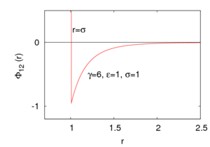 where is the intermolecular pair potential, is the distance between site 1 and site 2, is the hard diameter, is the energy well depth (), and is a parameter that controls the interaction range.