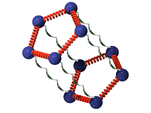 The following is a schematic for the interaction between two (purple) atoms. Here we show the atoms having five Trotter slices, forming what can be thought of as a "ring polymer molecule". The harmonic springs between Trotter slices are in red, and white/green bonds represent the intermolecular pair potential.